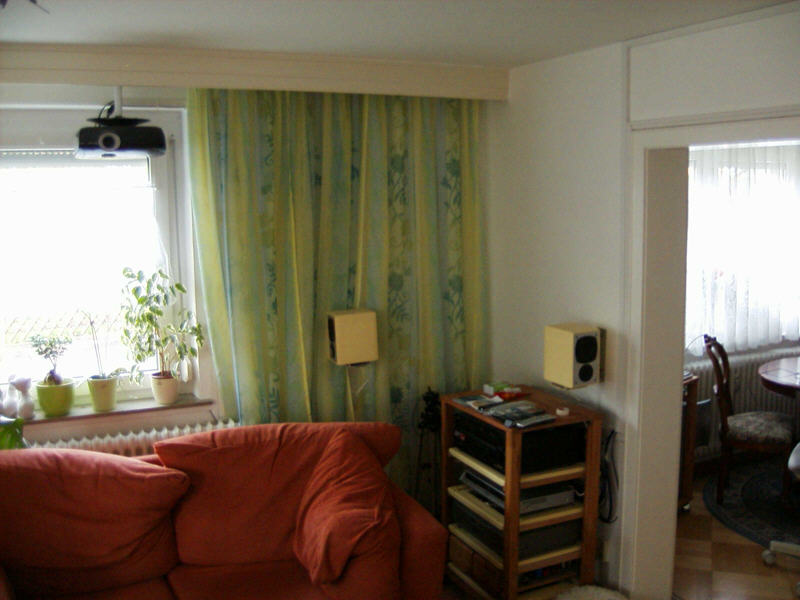 Die andere Sache wäre eine feste aber unsymmetrische Aufstellung mit Surround links direkt hinter dem Ohr meiner Frau (von meinem Hörplatz ca. 1,40m nach links) und Surround rechts ca. 2,40m neben mir. Dies aber mit sehr aufwendiger nachträglicher Kabelverlegung einem optischen Kompromiss.