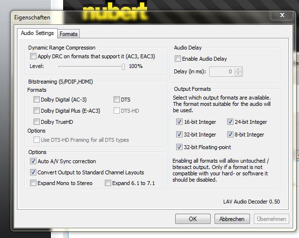 Frage: bei dem LAV Filter gibt es die Möglichkeit (siehe Bild) im Audiobereich DTS, Dolby etc über HDMI / Digital Ausgang einzustellen, als Bitstreaming. Wenn ich diese Option aktiviere, habe ich schon einen anderen Sound. Bei Deaktivierung ist alles leiser. Die Frage die sich mir stellt: Ist es besser diese Optionen einzustellen oder nicht? Bzw. rechnen die Nubis die DTS / Dolby etc. herunter bei Bitstreming? Wie stellt Ihr es ein?