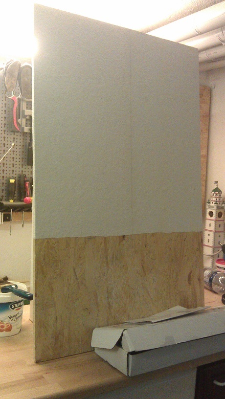 Da ist die Holzplatte - 1,2 mm OSB mit Tapete verkleidet, wird noch Weiß gestrichen: