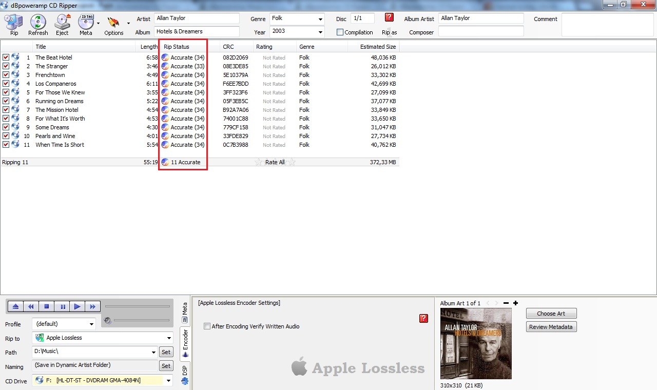 (alle 11 Tracks wurden akkurat gerippt, 33 bzw. 34 andere Rips aus der AcurrateRip-Datenbank entsprechen meinen Ergebnissen).