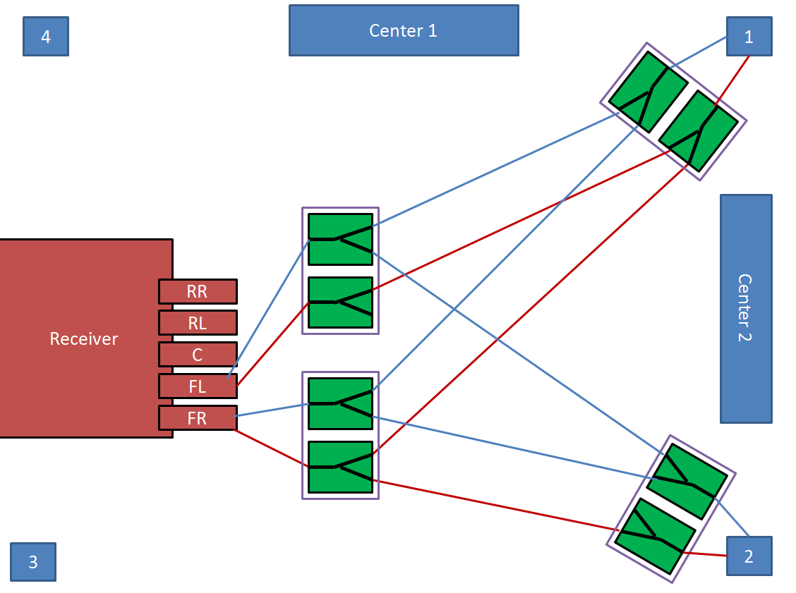 Komplizierter wird es bei den Surroundlautsprechern 1-4. Die Ausgänge am Verstärker sollen mit den Lautsprechern verbunden werden, dass einmal Lautpsrecher 1 und 2 als hinten links und hinten rechts und Lautsprecher 3 und 4 als vorne links und vorne rechts angesprochen wird. Und wenn ich umschalte dann sollen Lautsprecher 1 und 2 als vorne links und hinten links und Lautsprecher 3 und 4 als vorne rechts und hinten rechts angesprochen werden, so dass ich den Raum einmal in Längs- und einmal in Querrichtung beschalle.