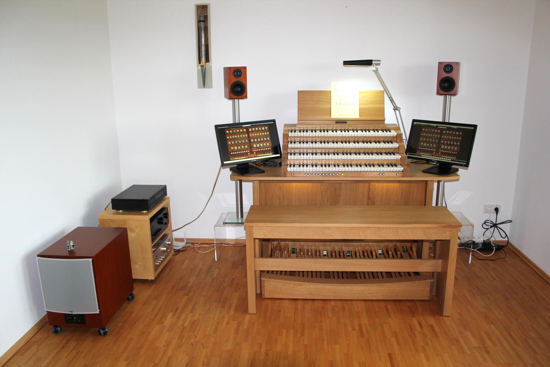 Neben dem PC benötigt man aber einen Spieltisch mit MIDI-Interface. Ein solches konnte meine alte Orgel leider nicht vorweisen und man konnte es auch nicht nachrüsten, also benötigte ich neue Hardware. Solche fand ich nach Besuchen bei verschiedenen Händlern in Südbayern. Der Besitzer des Ladens, selbst studierter Organist führte mir Hard- und Software vor, und beim Spielen meinte ich mit geschlossenen Augen tatsächlich in einer Kirche zu sitzen.