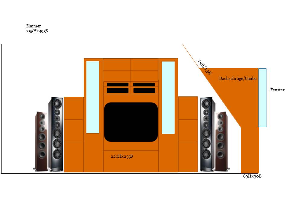 wenn ich das richtig sehe, sollen die Boxen quasi direkt an die Wand? Stereo ist nicht wirklich wichtig? Oder warum befindet sich im Bereich der Mittelsenkrechten (tolles Wort