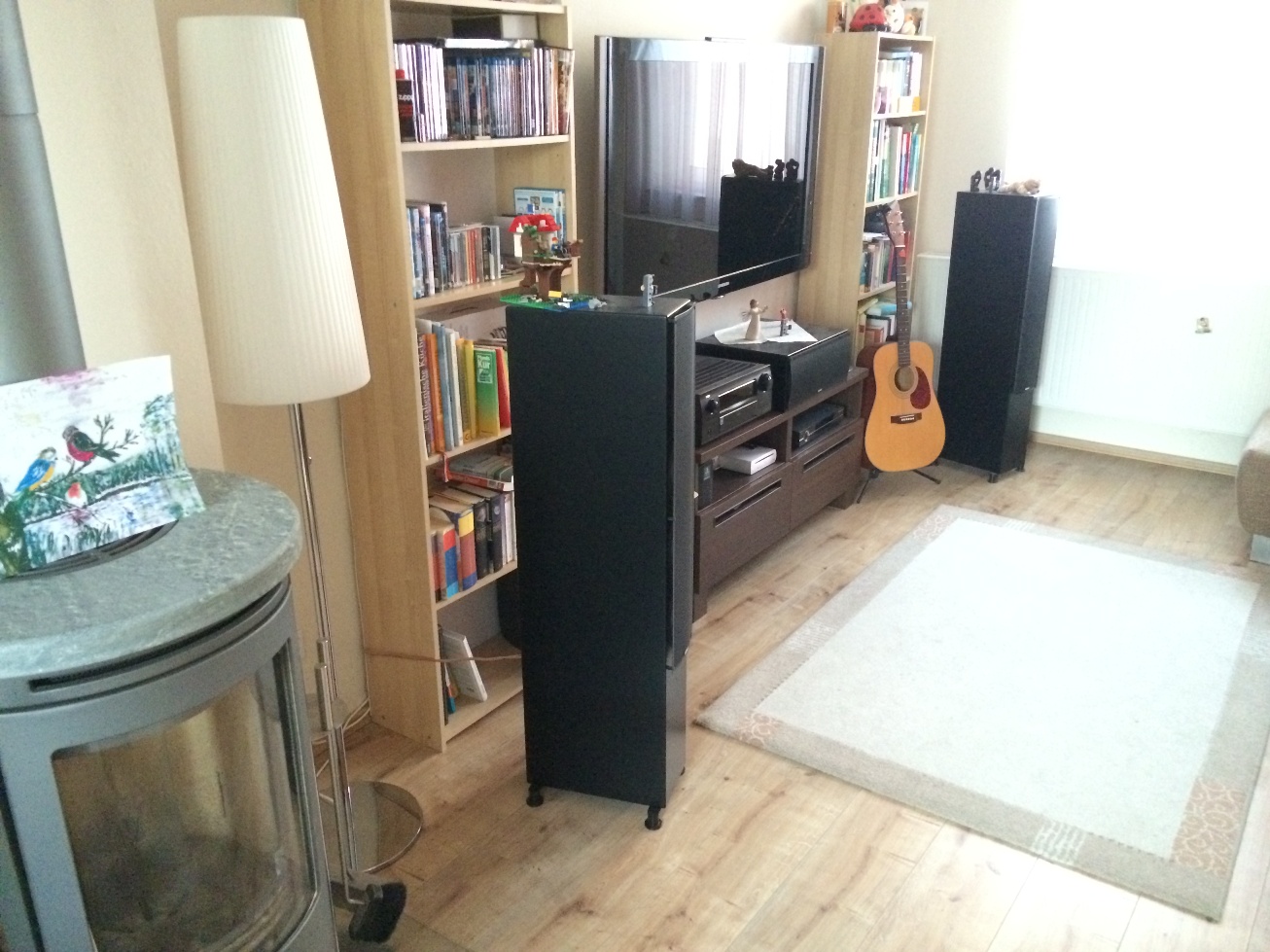 Beim Klatschtest merkt man eine gewisse Halligkeit, wobei ich das als Laie überhaupt nicht beurteilen kann. Ich führe das unter anderem auf die parallelen Wände (ca. 4,5 m Abstand) mit einer Rückwand (Nähe Hörposition) aus Trockenbau und den 52'' Flachbildfernseher ziemlich genau zwischen den Frontboxen zurück. Der Wandabstand der Frontboxen beträgt ca. 75 cm (Boxenvorderseite), den Zwischenraum hinter den Frontboxen habe ich übergangsweise mit unregelmäßig gefüllten Bücherregalen "bedämpft". Die Hörposition liegt leider sehr nahe an der Rückwand (Trockenbau, etwa 50 cm), was ich auch so hinnehmen muss. Aufgestellt ist das Ganze in einem recht passablen Stereodreieck (Abstand links-rechts: ca. 2,75 m, links/rechts-Hörposition: ca. 2,97 m - immer gemessen an der Membranfläche den obersten Tieftöners). Dabei sind die Boxen leicht Richtung Hörposition eingedreht. Diese Einwinkelung verbunden mit dem Boxenabstand erzeugt das bislang beste Ergebnis aus Stimmenortung und Bühne, wobei die Differenzierbarkeit, Ortbarkeit, Tiefenstaffelung und vorallem der Mittenbereich nach meinem Empfinden verbesserungswürdig erscheint.