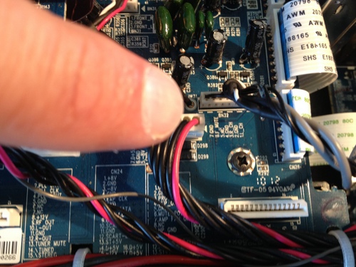 Jetzt muss man den Deckel von hinten nach vorne schieben - nicht abheben , es befindet sich eine Art Bajonettverschluss wie beim PC Gehäuse an oberen Deckel. Er wird quasi komplett nach vorne geschoben bis er die oberen Verschlüsse frei gibt, dann kann man ihn vorsichtig abheben. Am Deckel befestigt sind zwei Flachband Kabel die auf den beiden oberen Platinen der Vorstufe und Videosektion befestigt sind . Diese vorsichtig von den Platinen lösen - abziehen.