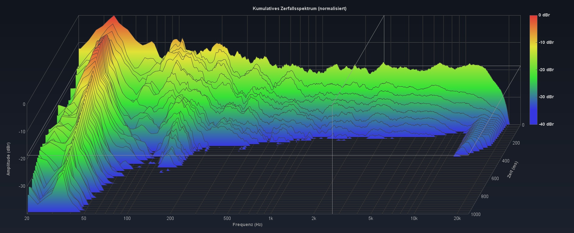 Bei Nachhall schaut man idR auf einen Abfall von 35db ausgehend vom Originalpegel. Letzterer sollte sich dabei nicht an der extremsten Mode orientieren, sondern dem durchschnittlichen Pegel. Im Studio sind das Ziel meist 300ms bis der Pegel um 35db nachgelassen hat, sonst sind 500ms auch noch ein guter Wert. Ebenfalls sollte der Abfall möglichst gleichmäßig über das Frequenzband sein (mit Ausnahme des tieftonbereichs der immer sehr speziell ist).