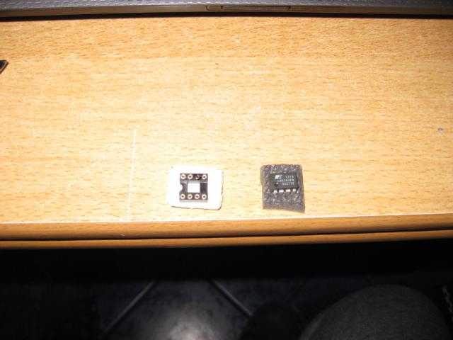 Das IC mit einem Cuttermesser von seinen Beinchen befreit. Die Pins einzeln ausgelötet.Der Siwi oben rechts kam nach dem IC ist aber einfach zu tauschen. Der Sockel und das neue IC. Der Sockel ist nicht unbedingt nötig und Original auch nicht vorhanden, aber wenn das Ic nochmal defekt geht, ist die Rep in 10.min erledigt.