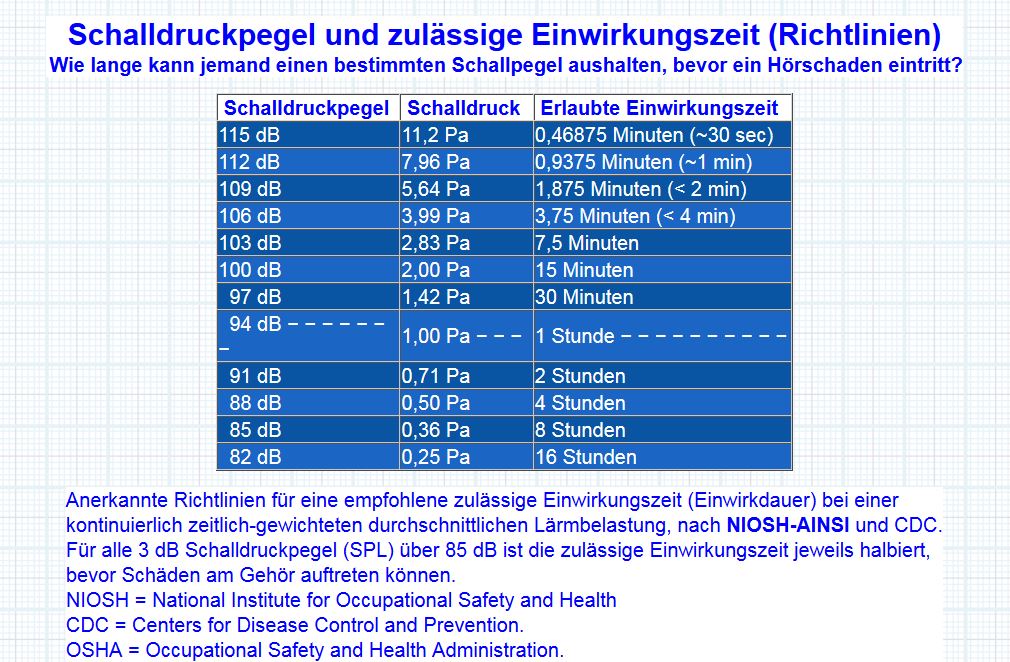 Nach der Tabelle über die Einwirkzeit müssten dann aber alle Discobesucher einen Hörschaden haben, da ist man mehrere Stunden einem Pegel von 100dB ausgesetzt :mrgreen: