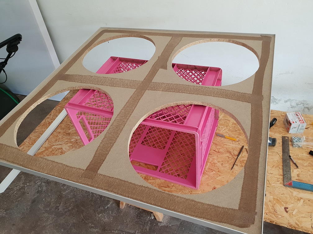 Der Plan für die Segel und die Raumakzeptanz war im Kopf. Gut dann mal 4 qm mit den Maßen 50x50x5 bestellt. Dazu 4 Holzplatten 97x97x19 und Alu L Profile 20x30 geordert. Abhängesysteme für Bilder und los gehts.