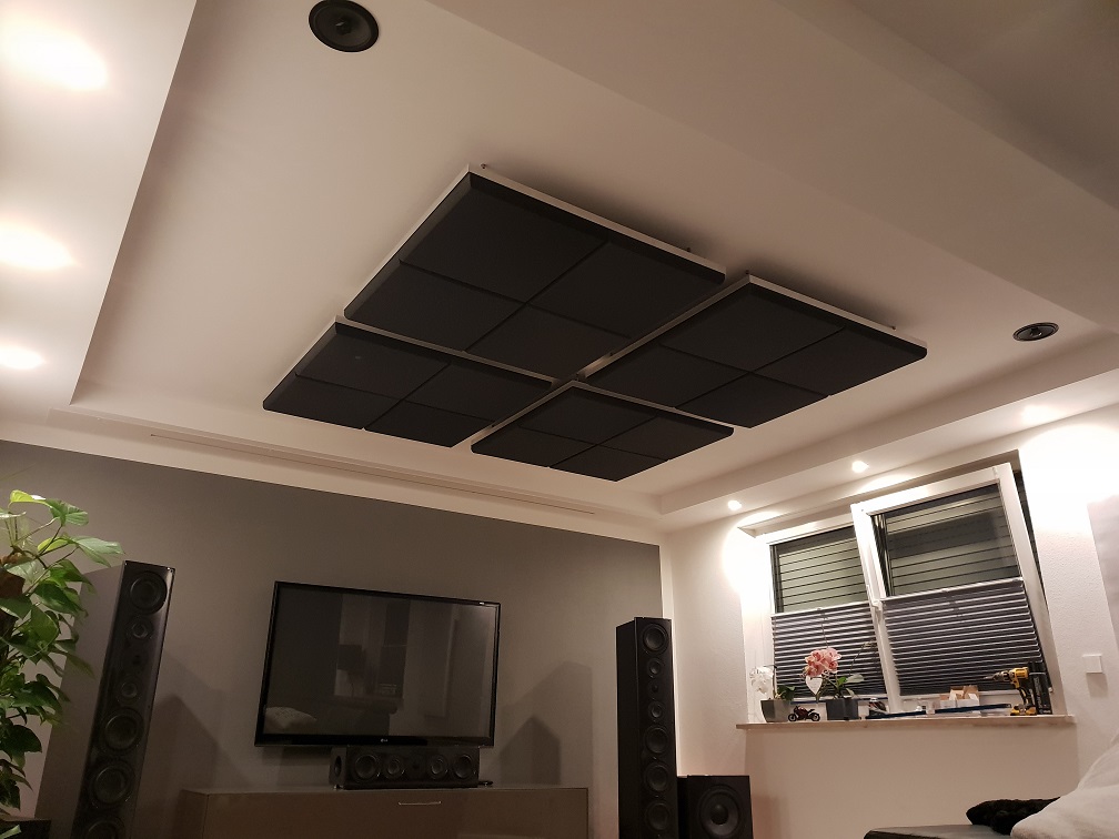 Hab in der zwischenzeit den Weg des geringeren Wiederstandes gewählt und einfach mal Basotectplatten bestellt 100x50x5 und diese an der Rückseite (Eckpunkte) mit Metallplatten beklebt und via Magnetstreifen an der Decke befestigt. In Summe 2qm ohne Deckenabstand. Das Ergebniss war schlichtweg maginal zu hören bzw zu spüren. Gemessen hab ich erst gar nicht.