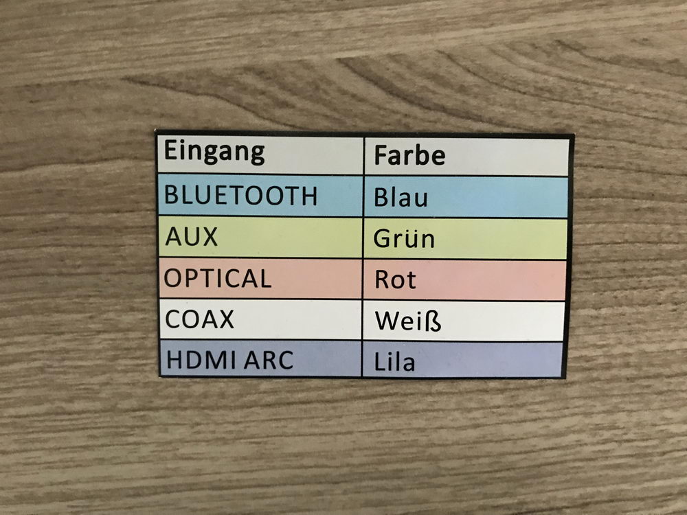 Apropos Einstellungen, Eingaben an der Fernbedienung werden mit einer kleinen, blinkenden Leuchtdiode angezeigt, die auch die einzelnen Eingänge farblich anzeigt. Gut gelöst, wie ich finde. Auch gibt es eine kleine Tabelle, die die farblichen Zustände der Eingänge zeigt.