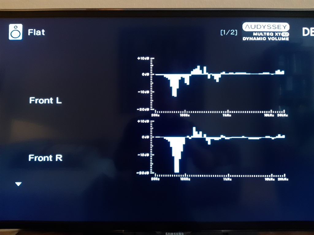 Audyssey bügelt das im Flat-Modus zwar weg, aber es klingt dann dünn und farblos. Wenn ich allerdings die Kurve auf den EQ lege und dann bei 63 Hz um 1 dB erhöhe, dann klingt es obenherum und mittig schön frei und luftig und untenherum ganz gut, teils ein Bissel trocken. So klingt es auch besser als mit Basschalter der LS auf reduziert.