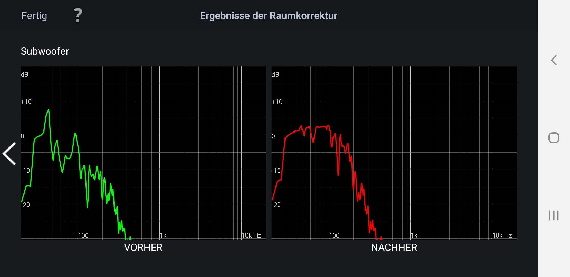 Entweder frisst die Leichtbauwand wirklich den ganzen Bass oder da ist noch ein anderes Problem. Die Handy-Bildchen der App helfen nicht. Du müsstest wirklich mit einem Mikro nachmessen. Die 100€ sollten drin sein (Umik-1) und dann mit REW nachmessen. Sonst befürchte ich stochern im Nebel.