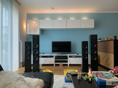 vielen Dank für eure Rückmeldungen! Ich hab euch hier mal ein Bild von der Aufstellung im Wohnzimmer gemacht. Hinter dem Sofa ist die Wand vollständig mit Billy-Bücherregalen "optimiert". Hör- und Boxenpositionen stehen ungefähr auf 1/5 der Längsrichtung.