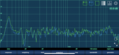 Auch mit dieser vermutlich nicht ganz genauen Messung mit dem Handy sieht man sehr gut: Da ist eine 15-20dB Überhöhung im Bass bei ca. 33-35Hz. Vermutlich die erste Längsmode. Die dickt den Bass erheblich auf und es dröhnt im Raum, wenn die Frequenz getroffen wird. Die 2. Längsmode ist bei der doppelten Freuquenz noch mal als halb so starke Überhöhung bei 65-70Hz zu sehen. Beides zusammen wird den Bass im Raum unangenehm dröhnend machen. Noch mehr Bass durch den größeren LS macht es noch unangenehmer. Wenn der Sitzplatz nun noch nah an der Rückwand ist, kommt nur noch Brei an.