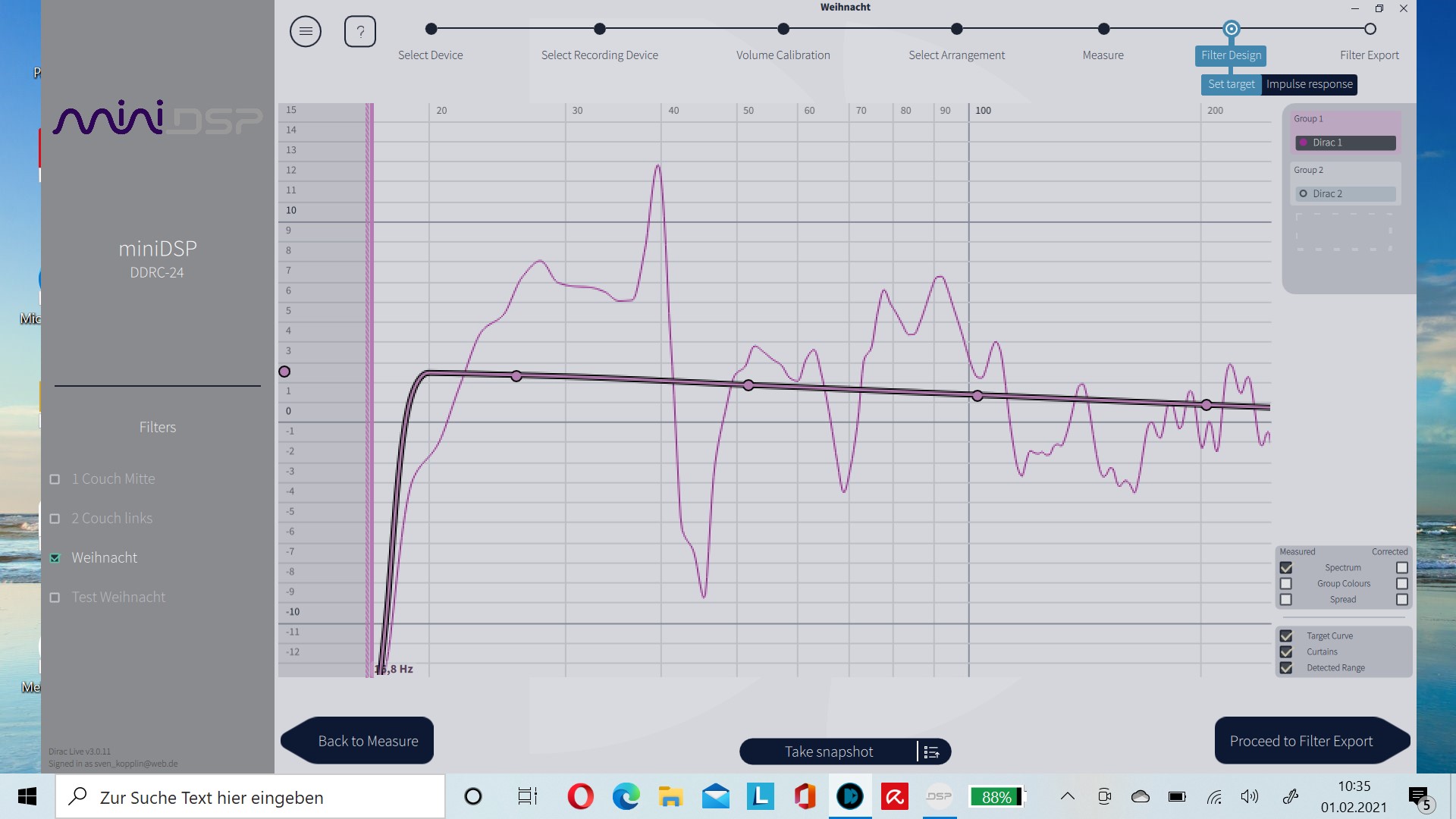 Seit ca. 7 Wochen nutze ich minidsp 2x24 Dirac und bin sehr zufrieden. (Bis auf ein Rauschen, das weniger ein akustisches als "mentales" Problem darstellt.) Ich betreibe ein Paar NV 110, nun in unsymetrischer Aufstellung (Hauptgrund für die Einmessung). Wegen der Raummoden vor der Einmessung habe ich bei beiden Boxen eine BR-Öffnung dicht verschlossen und bei der rechten wandnahen Box zusätzlich den Bass mittels Schalter reduziert und bekam so ein recht zufriedenstellendes Klangbild. In diesem Zustand habe ich auch eingemessen.