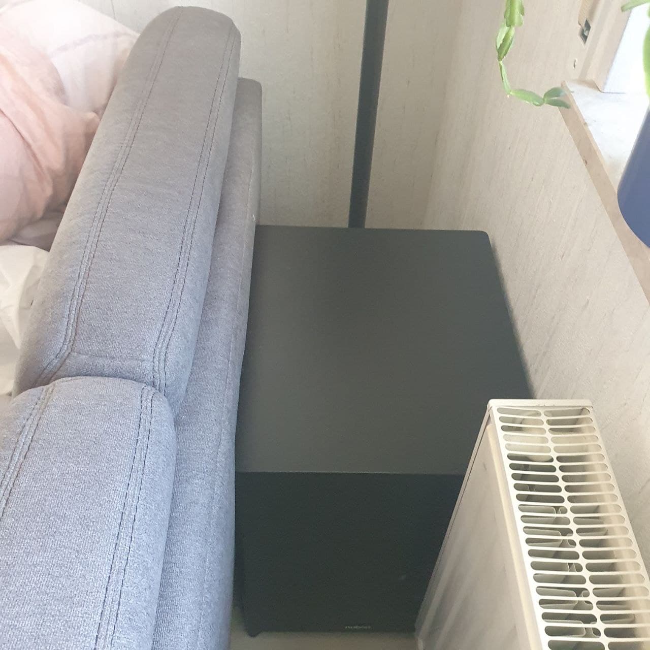 Der Standort für den XW-1200 war sofort erstmal klar. Hinterm Sofa am Hörplatz. Jetzt werdet ihr sagen, hey, der ist ja total eingequetscht und kann sich nicht entfalten, muss ich sagen, die nahe Aufstellung an der Wand und Sofa (untenrum ist das Sofa offen ca. 15cm) ist für mich perfekt. Es ist keine Basserhöhung oder Raummoden vorhanden, durch den neuen Yamaha AVR. Der bügelt das richtig gut weg, im Gegensatz zum alten AVR.