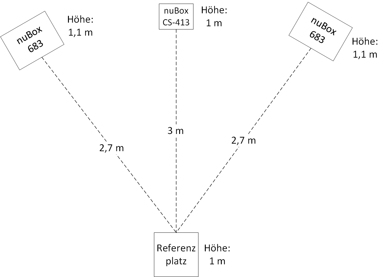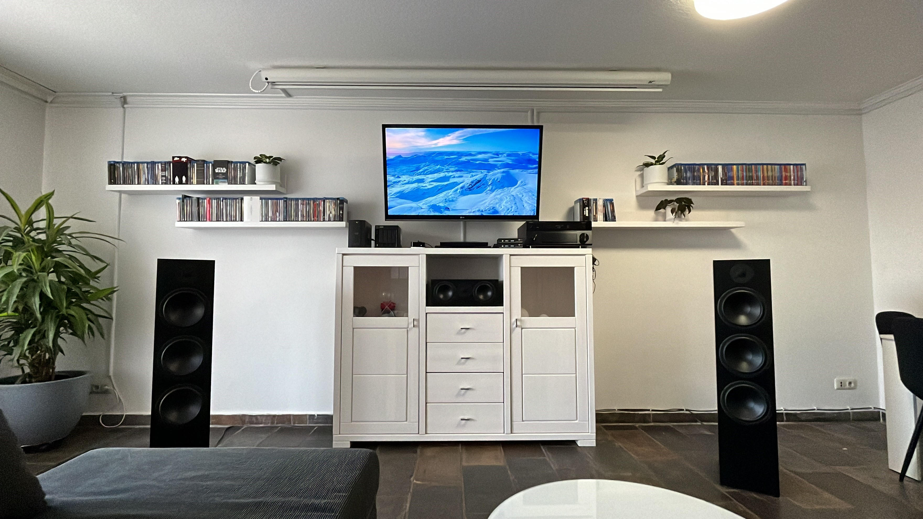 das ist mein derzeitiges Setup: Der Ultraweitwinkel verzehrt das Bild etwas. Die Fronts stehen im Stereodreieck und die Hochtöner der Lautsprecher sind auf Ohrhöhe. Der Center schließt bündig mit der Unterkante ab, hat zu den Seiten jeweils 4, nach hinten 7 und nach oben 17 cm Platz. Laut Anleitung braucht er ja nur 3 cm, aber das ist anscheinend zu wenig ...