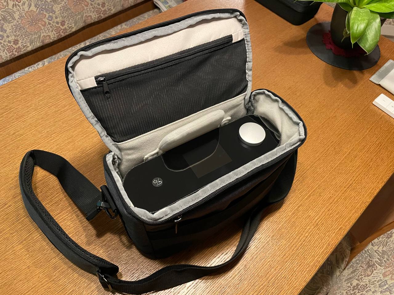 Ist eine ausreichend gepolsterte Kameratasche, die noch Kletttrenner dabei hat, die ich an die lange Rückseite geklettet habe, um die abstehende Antenne etwas besser zu Puffern. Die Antenne ist damit unter dem Polster. Von den Maßen her gut und hat vorne noch eine Tasche für Kleinkram, wenn man die nuGo One mit auf Tour nimmt.