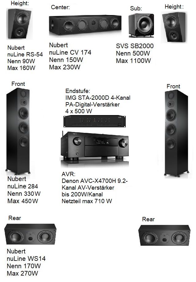 Mein Setting sieht man im Bild. Ohne den aktiven Sub liegt die gesamte Lautsprecher Leistungsaufnahme bei 1330 W sinus und 1990 W maximal. Da ist es klar, dass mein Onkyo TX-NR646 mit seinen 160W/Kanal und seinem 500 W-Netzteil nur einen Bruchteil der Leistung der Lautsprecher realisiert. Deswegen habe ich mir gestern einen Denon AVC-X4700H gekauft, um meinen Onkyo TX-NR646 zu ersetzen. Der Denon ist nun auf dem Weg zu mir.