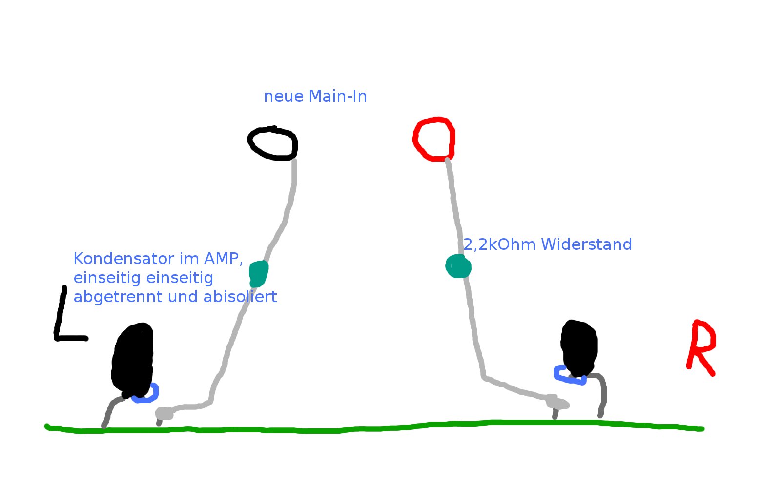 Ich weiß nicht, ob ich den Text in der Bilddoku richtig verstanden habe. Ich würde den Kondensator im AMP jeweils an der innenliegenden Seite abtrennen und abisolieren und am Kontakt auf der Platine den Kupferdraht für die neuen Main-In festlöten. Auf dem Weg zum Main-In sitzt dann jeweils der 2,2kOhm Widerstand.