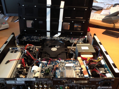 Jetzt muss man den Deckel von hinten nach vorne schieben - nicht abheben , es befindet sich eine Art Bajonettverschluss wie beim PC Gehäuse an oberen Deckel. Er wird quasi komplett nach vorne geschoben bis er die oberen Verschlüsse frei gibt, dann kann man ihn vorsichtig abheben. Am Deckel befestigt sind zwei Flachband Kabel die auf den beiden oberen Platinen der Vorstufe und Videosektion befestigt sind . Diese vorsichtig von den Platinen lösen - abziehen.