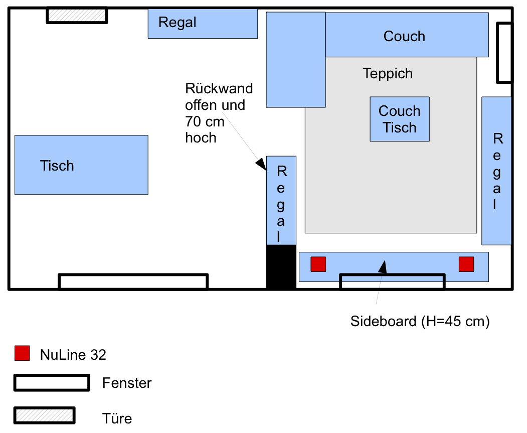 Die NL32+ATM stehen auf einem Sideboard im Abstand von ca. 250 cm. Abstand Hörplatz ca. 350 cm.