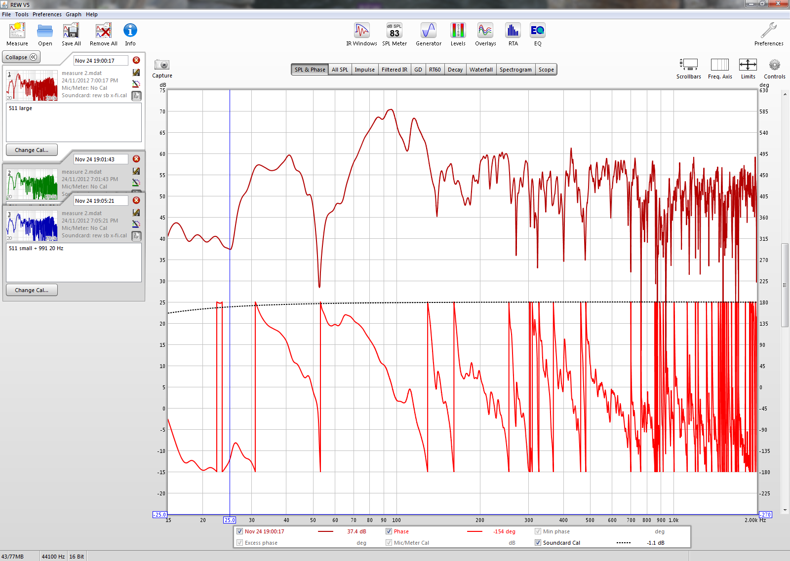 Das nächste Diagramm zeigt nur die Messung A mit den 511ern auf large und zusätzlich die Phase: Hier sieht man dass sich bei den problematischen 52 Hz die Phase dreht. Könnte das für den Einbruch bei 52 Hz verantwortlich sein?