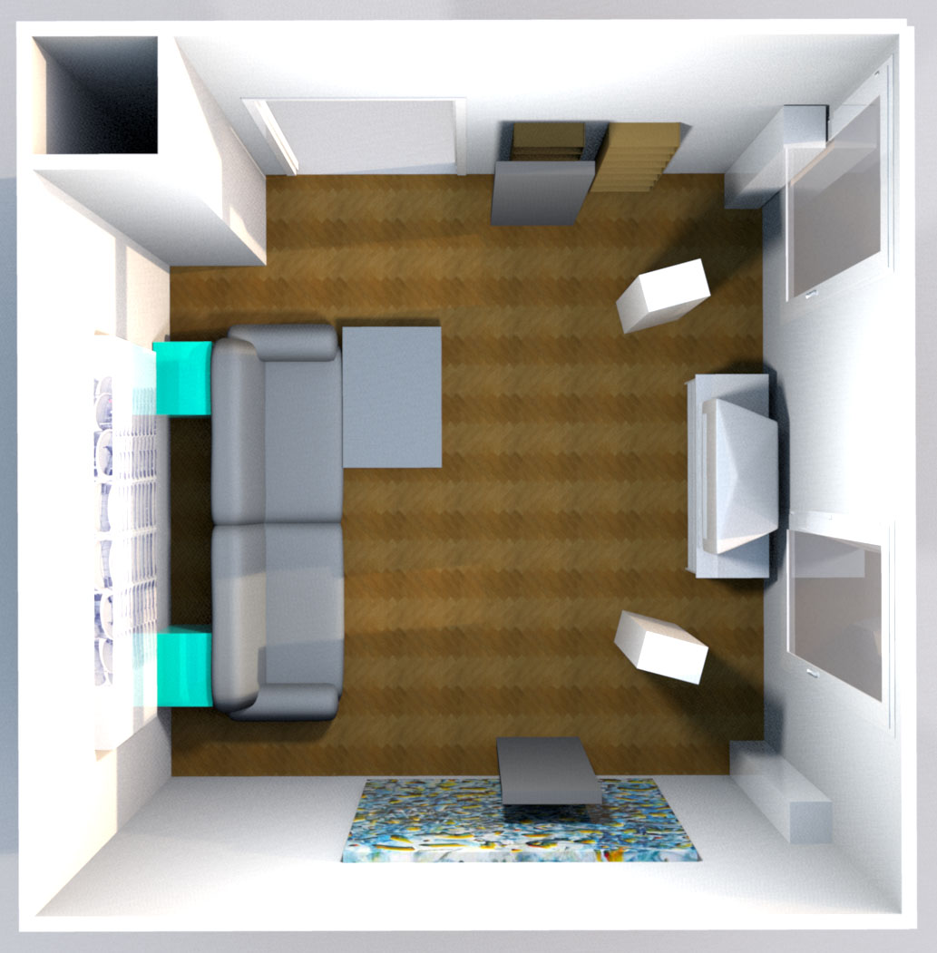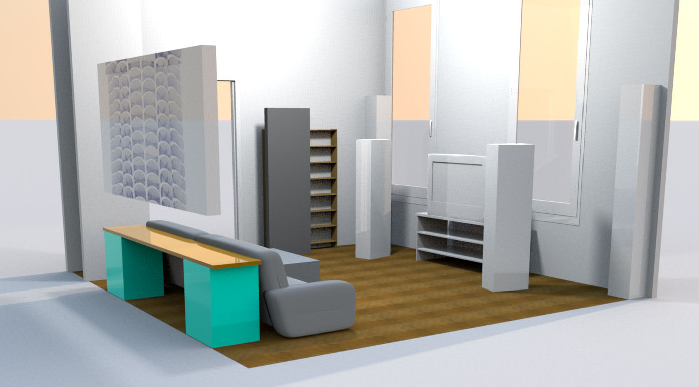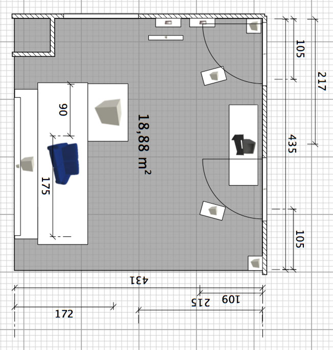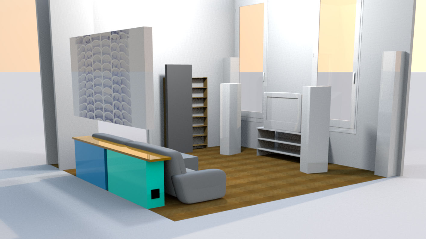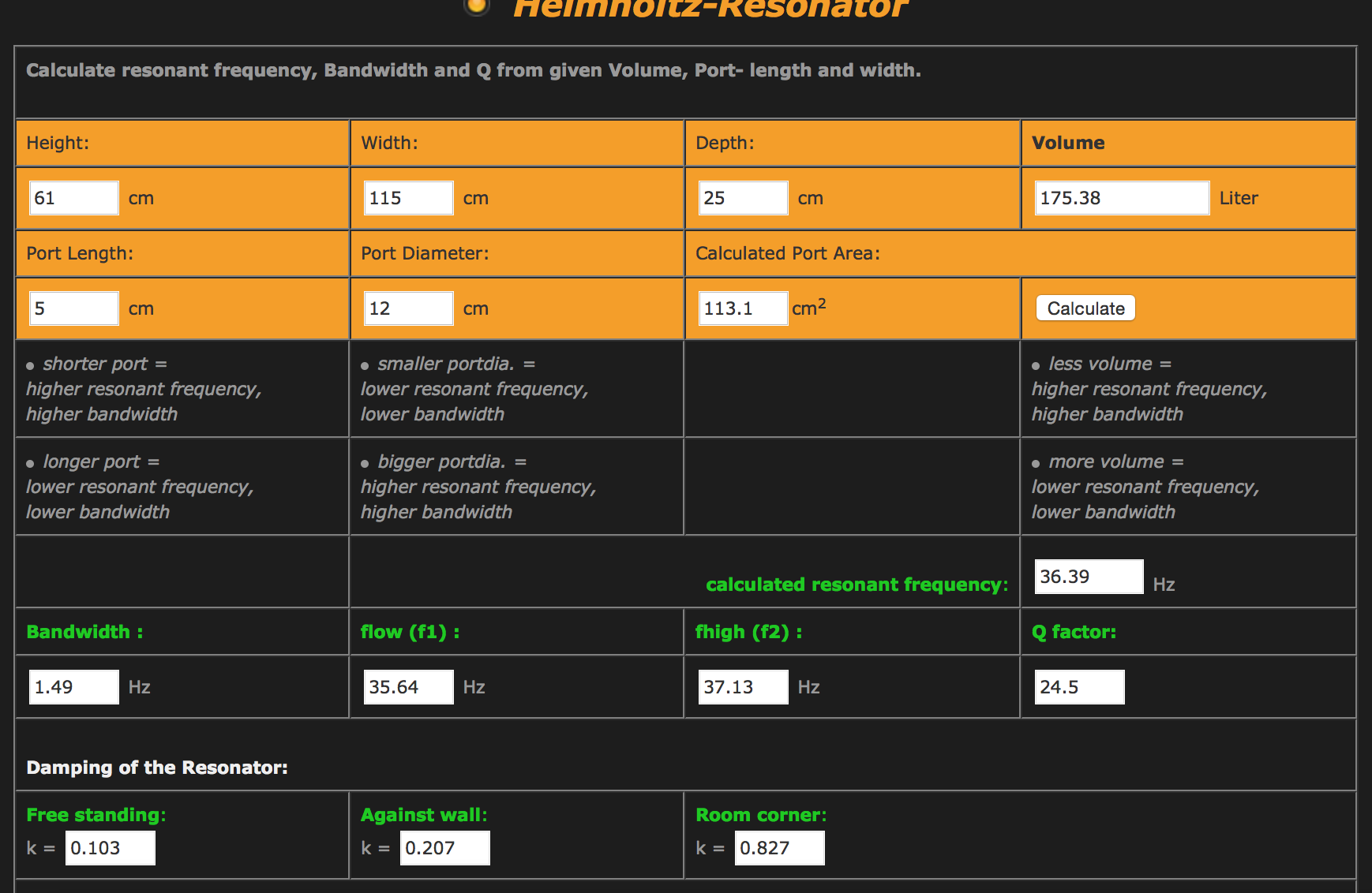 Damit das nicht unseren schönen Raum torpediert, habe ich folgende Überlegung. Wir haben eine sehr ausgeprägte Raummode bei 37 Hertz aufgrund des quadratischen Raums. Dieser Raummode könnte ich nun mit zwei Resonatoren begegnen, welche jeweils rechts und links hinter der Couch stehen. Darüber wird eine schöne Holzplatte montiert, welches als Regal und Ablage hinter der Couch dient. Die Bassreflex Öffnung zeigt in Richtung Ecke.