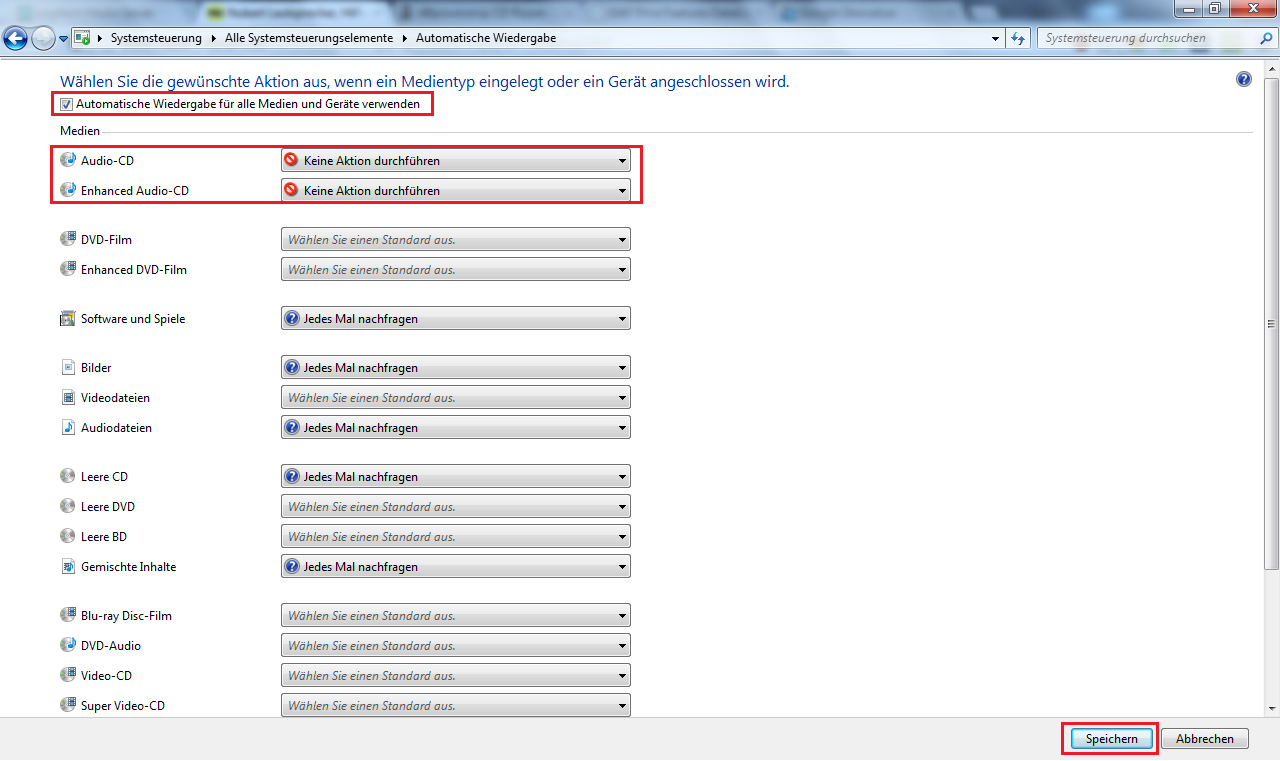- entweder das Häkschen oben links weg setzen, oder die Autorun Funktion grundsätzlich aktiv lassen aber entsprechend für Audio CD´s anpassen.