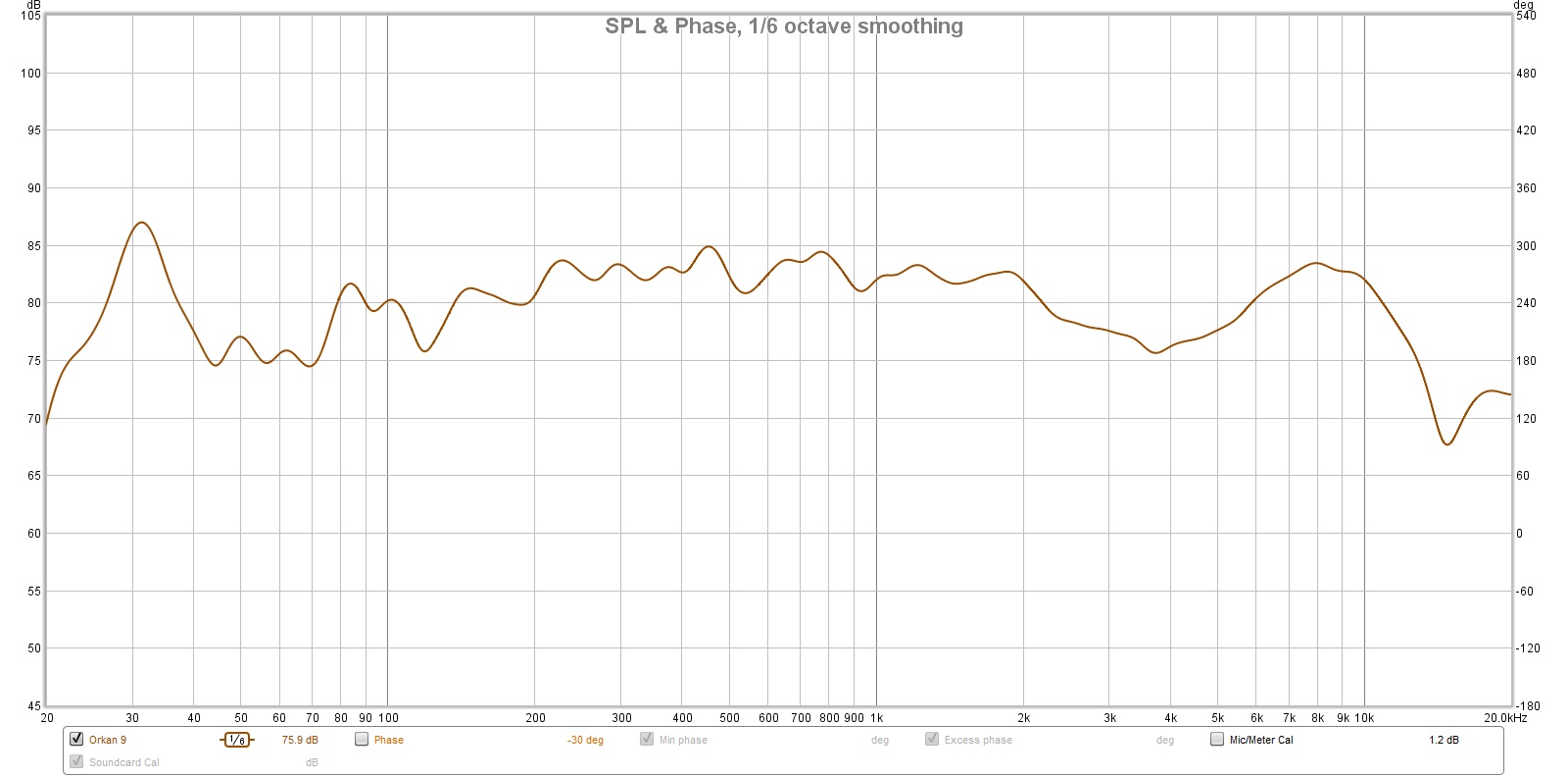 Man sieht ganz gut meine Raumresonanz, bei etwas über 30 Hz, diese ist schon per nuControl reduziert, vorher war's schlimmer... Ansonsten ist so oberhalb der 100 Hz alles im Rahmen der Wohnraumgenauigkeit recht linear.