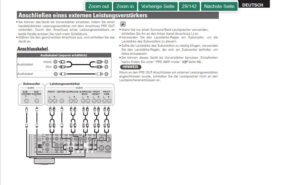 Was den AV-Receiver betrifft, sollte der AVR bereits die Möglichkeit für einen Anschluss einer potenten Endstufe an den Front-Pre-Out-Anschlüssen auf der Geräterückseite bieten. Ob Sie dies mit dem vorhandenen AV-Receiver machen oder aufgrund dessen ein anderes passendes Gerät wählen ist gleich. Der AV-Receiver ist in seiner Leistungsausbeute natürlich begrenzt. Die nuVero 11 will jedoch ordentlich versorgt werden, um hier dann mehr Potenz zu erhalten kann eine potente Endstufe alleinig für die nuVero11 angewendet werden. Dies entlastet dann den AV-Receiver.
