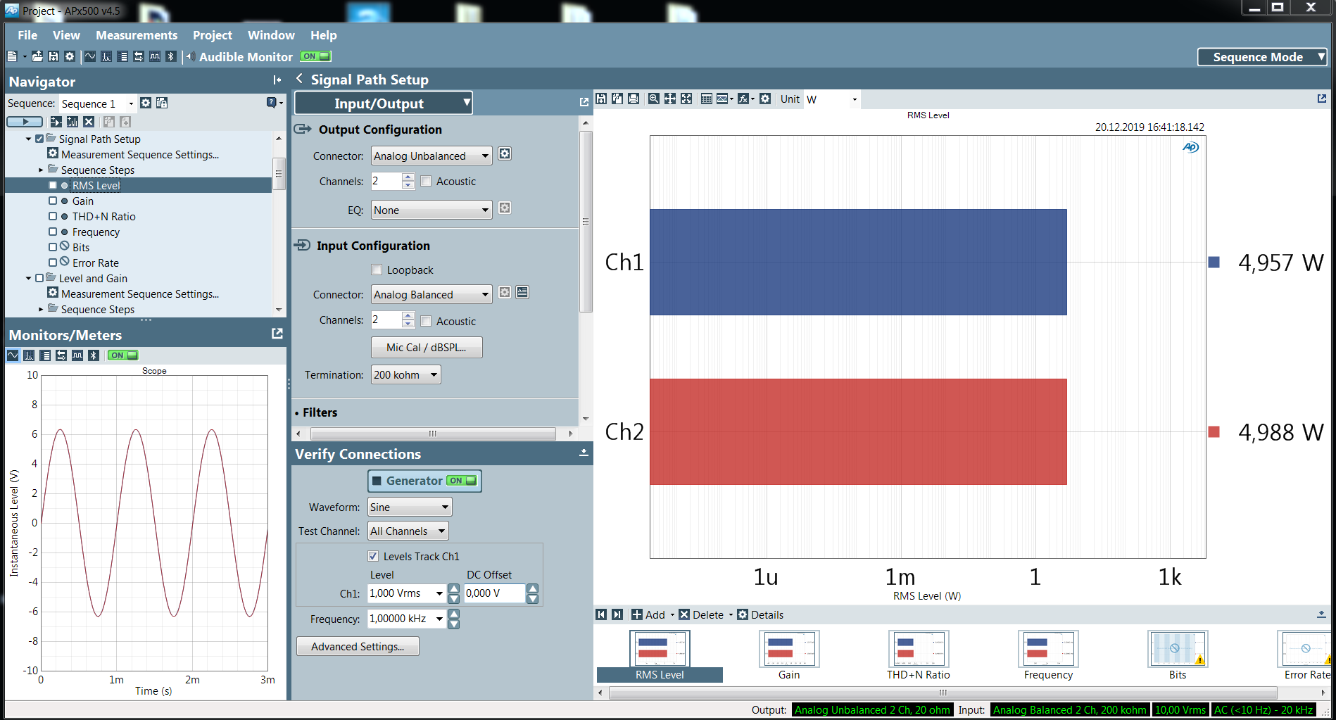 Die Erregerfrequenz liegt bei 0 dB mit einem analogen Eingangssignal von 172 mV rms. Um die Messbedingungen anzugeben, werden in unseren Screenshots die entsprechenden Einstellungen gezeigt. Hier geht es aber nicht um 5 Watt, da sich sonst kein 0-dB-Bezug über 4 Ohm am gemessenen Ausgang ergeben kann.