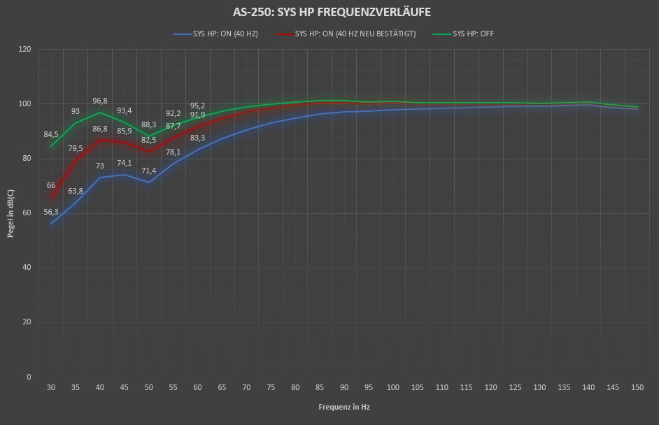 Edit: Habe mal aus Interesse mit einem Pegelmessgerät nachgemessen, schalte ich den Hochpass auf den kleinsten Wert, also 40 Hz, so merke ich bis über 120 Hz noch eine geringere Pegelausgabe der AS-250, je tiefer die Frequenz desto größer wird der Pegelunterschied natürlich. Kommt mir etwas viel vor diese Frequenzbeschneidung
