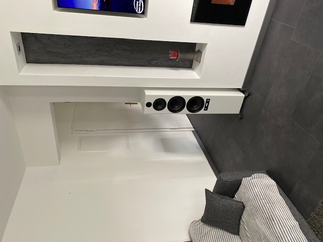 Die Wand ist so Breit, dass der rechte Lautsprecher nicht mehr in die Nische passt, da er zu breit ist und die Nische mit der Fensterbank zu schmal.