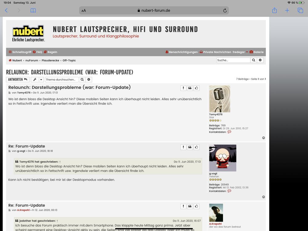 Kann ich nicht bestätigen; bei mir ist der Desktopmodus vorhanden.Tomy4376 hat geschrieben: Do 11. Jun 2020, 17:13 Wo ist denn bloss die Desktop Ansicht hin? Diese mobilen Seiten kann ich überhaupt nicht leiden. Alles sehr unübersichtlich so in Fettschrift usw. Irgendwie verliert man die Übersicht finde ich.