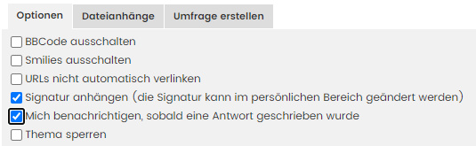 Wenn man im entsprechenden Feld unter dem Editorfenster einen Haken setzt, wird man benachrichtigt (auf Wunsch auch per Mail), wenn jemand eine Antwort in dem betreffenden Thread verfasst. Diese Funktion bietet sich vor allem dann an, wenn man eine Frage stellt und auf Antworten von der nuGemeinde hofft. Aber Vorsicht: Gerade wenn man E-Mail-Benachrichtigungen aktiviert hat, besteht die Gefahr, dass man von einer regelrechten Nachrichtenflut überschwemmt wird, wenn unerwartete viele Diskussionsteilnehmerinnen und -teilnehmer auf das Thema eingehen.