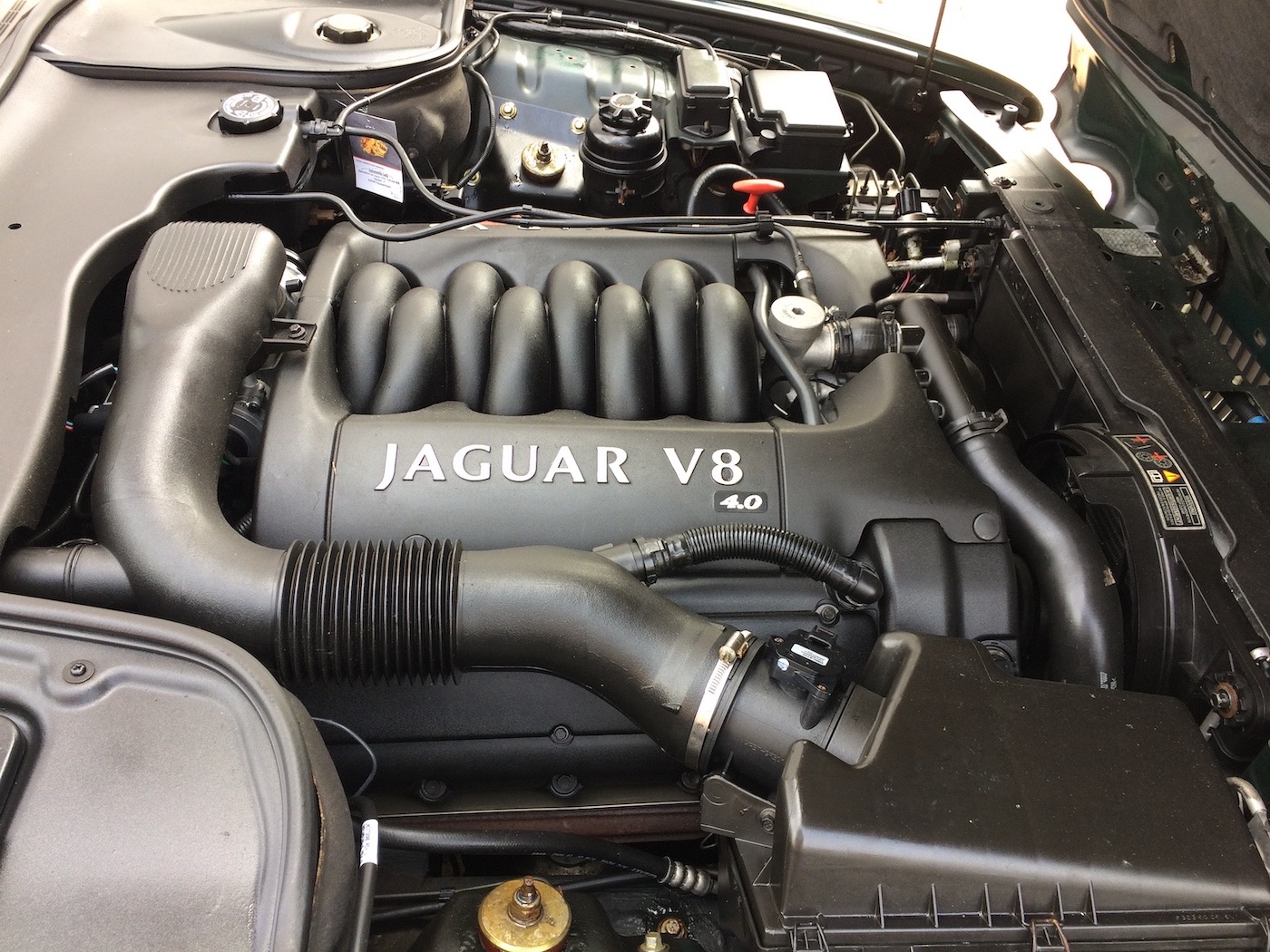 So alt sieht der Motorraum des Jaguar gar nicht aus. Der niedrige Verbrauch suggeriert auch eher ein jüngeres Baujahr, also noch kein Oldtimer.