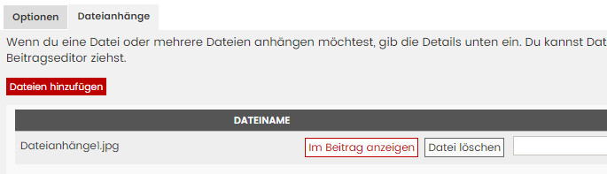 Dort heißt es (Zitat) Damit man ein Bild in einem Beitrag verwenden kann, muss man es nicht nur im Menü Dateianhänge hinzufügen (es lassen sich auch mehrere Files gleichzeitig auswählen), sondern muss es anschließend auch über den Button "Im Beitrag anzeigen" in das Thema einbinden