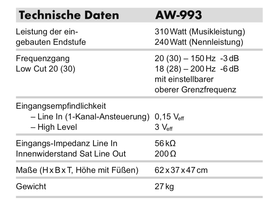 Google => "nuBox AW-993" => gleich der allererste Eintrag führt zum offiziellen Nubert-BDA => Seite 7 => technische Daten :roll:
