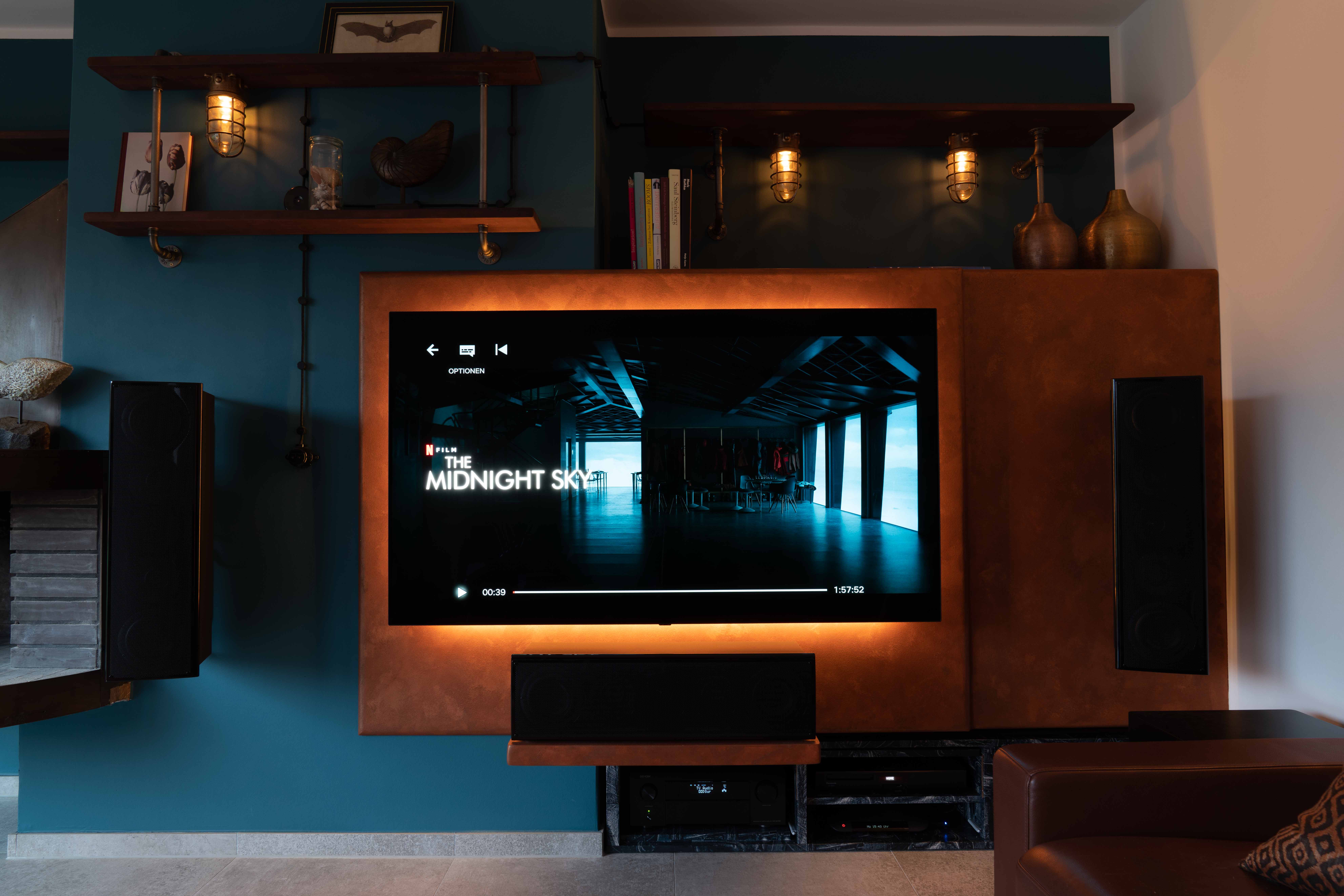 ) für die große Variante mit 3x nV70 vorn, 2x nV 50 seitlich/hinten und 1x nuSub XW-900 entschieden. Die beiden Front-LS wurden nun doch mit den original Nubert-Wandaufhängungen angebracht (die zwischenzeitlich mal angedachte DiY-Variante mit Halbzoll-Wasserrohren erschien mir angesichts der 19 kg Boxengewicht doch als zu riskant). Der Center ruht auf einem Sperrholzplatte, die wiederum mit sehr stabilen Edelstahlwinkeln an die Wand unterhalb des TV geschraubt wurde.