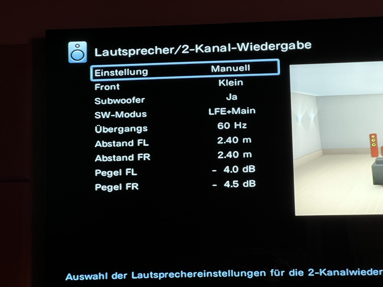 Die Einstellungen im Receiver sind grob: Pegel 0dB unverändert, LFE+Main und DD-Signal über FireTV-Stick.