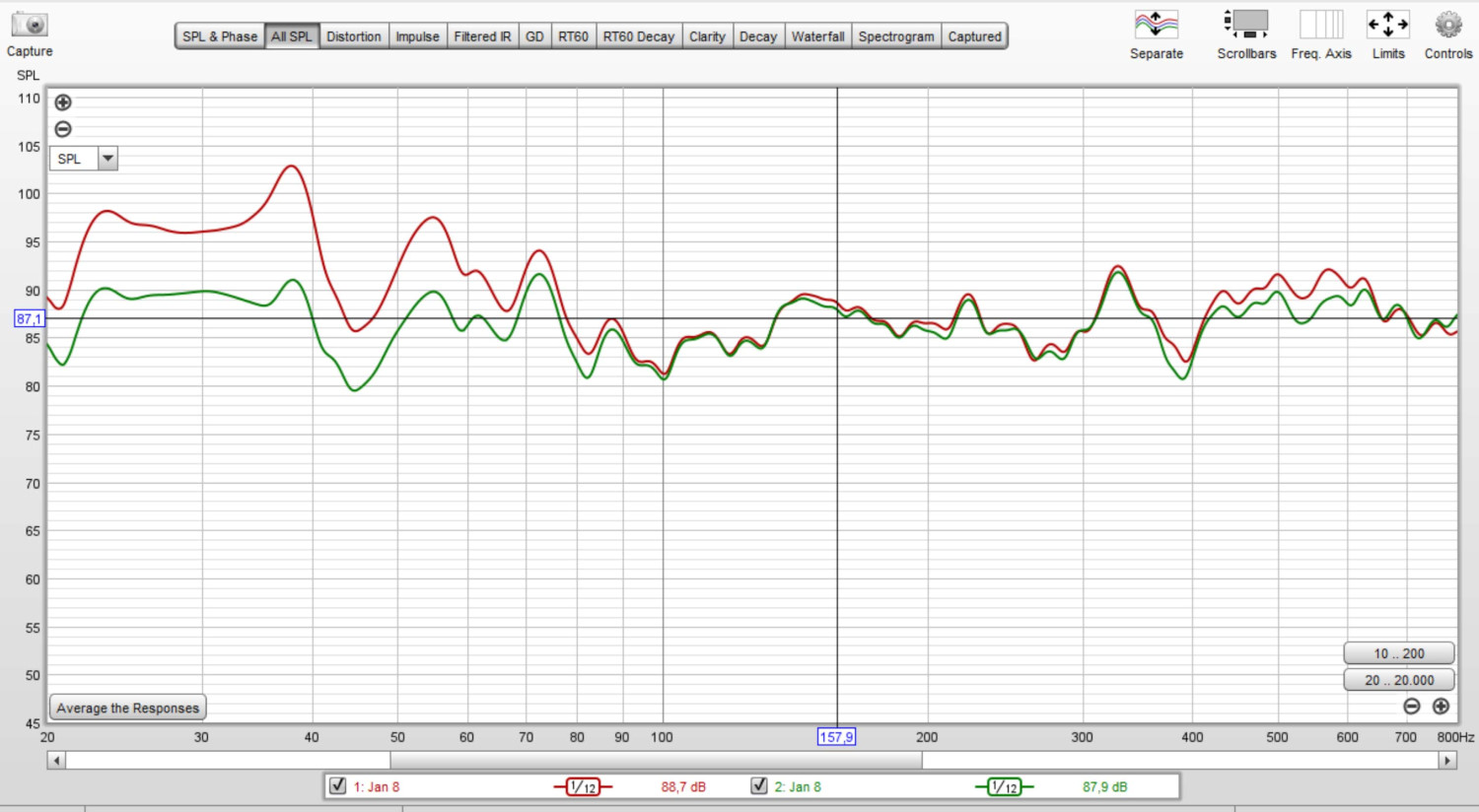 Also hatte ich schon im Vorfeld die wirklich tolle REW-Software (Room EQ Wizzard) heruntergeladen und installiert. Nach dem ersten Höreeindruck der Boxen in den eigenen vier Wänden war dann auch schnell klar, dass ein Messmikrofon zum Einsatz kommen muss, um die akustischen Resonanzen genauer zu identifizieren. Empfohlen wurde von REW das miniDSP UMIK-1. Am Freitag ist es angekommen und abends habe ich dann die Messungen durchgeführt. Und der Höreeindruck bestätigte sich: es gibt deutliche Raumresonanzen bei 25, 37 und 55 Hz. Die entsprechenden Filtereinstellung lassen sich über die Software ganz leicht ermitteln und die Parameter entsprechen genau den Equalizer-Einstellungen bei dem Vorverstärker NuControl 2. Ich habe noch ein bißchen die Gains, also die Absenkungen der entsprechenden Überhöhungen, variiert, um einen möglichst gleichmäßigen Frequenzgang bis ca. 800 Hz zu erhalten. Ich habe euch einmal die Frequenzgänge ohne und mit Equalizer angehängt.