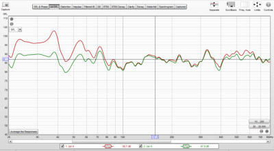 Also hatte ich schon im Vorfeld die wirklich tolle REW-Software (Room EQ Wizzard) heruntergeladen und installiert. Nach dem ersten Höreeindruck der Boxen in den eigenen vier Wänden war dann auch schnell klar, dass ein Messmikrofon zum Einsatz kommen muss, um die akustischen Resonanzen genauer zu identifizieren. Empfohlen wurde von REW das miniDSP UMIK-1. Am Freitag ist es angekommen und abends habe ich dann die Messungen durchgeführt. Und der Höreeindruck bestätigte sich: es gibt deutliche Raumresonanzen bei 25, 37 und 55 Hz. Die entsprechenden Filtereinstellung lassen sich über die Software ganz leicht ermitteln und die Parameter entsprechen genau den Equalizer-Einstellungen bei dem Vorverstärker NuControl 2. Ich habe noch ein bißchen die Gains, also die Absenkungen der entsprechenden Überhöhungen, variiert, um einen möglichst gleichmäßigen Frequenzgang bis ca. 800 Hz zu erhalten. Ich habe euch einmal die Frequenzgänge ohne und mit Equalizer angehängt.