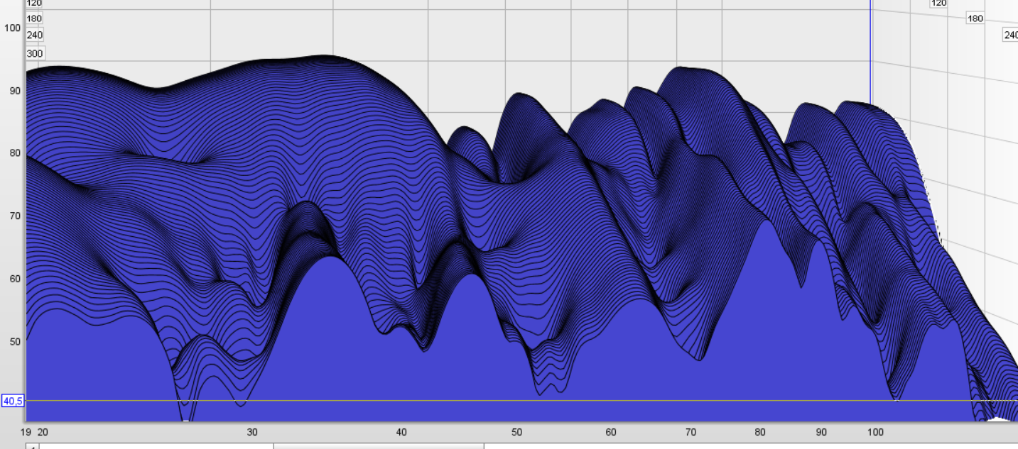 Deutlich glatter und die Moden sind nicht so stark ausgeprägt. Man sieht auch gut, wie die Wirkungsweise zu den höheren Frequenzen hin abfällt (eben abhängig von der Entfernung der Subs untereinander). Und man erkennt m.E. auch die Wirkung des DBA: in einer klassischen Multi-Sub-Konfig ist ja das Ziel, die Phasen anzugleichen, um den maximalen Output rauszuholen. Hier haben alle 5 Subs eine positive Raumanregung bei 33Hz, und trotzdem wird in der Summe die Mode reduziert.