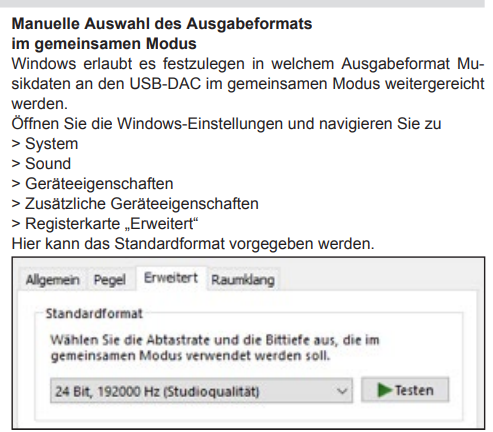 Edit: Um keine Verwirrung zu stiften. Wenn Du einfach vollumfänglich Windows 10 inkl. dem zugehörigen Player „Groove“ mit den nuPros verwendest, dann musst Du Dir um den exklusiven Modus keine Gedanken machen. Dann stelle einfach die gewünschte Bitrate und-tiefe ein und fertig! Was man da einstellt ist reine Ansichtssache - ich würde 44,1/24 einstellen, andere wie hier vorgeschlagen alles auf 96/24 upsampeln oder auch ein Vielfaches von 44,1 wie 176,4/24 wählen.