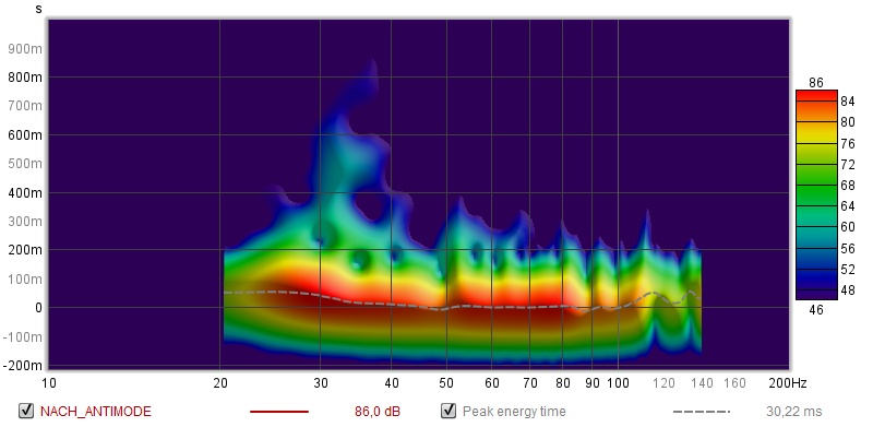 der Nachhall sieht nur wegen der Skalierung so harmlos aus, die Hauptmode bei 33Hz läuft eher 600ms für -30dB
