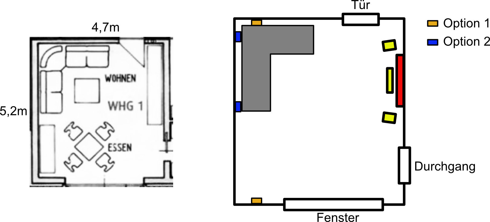 Wenn allein, wirst Du ja vermutlich ziemlich weit rechts auf der Couch sitzen. Dann wäre Option 1 eine ganz gute Lösung, um einen halbwegs immersiven Klang zu bekommen. Wenn mehrere Leute auf der Couch sitzen, wäre vermutlich Option 2 die bessere Wahl. Ich würde in dem Fall die Lautsprecher ein gutes Stück über Ohrhöhe aufhängen. Wenn Du die Möglichkeit hast, den rechten Rear-Speaker noch ein Stück nach rechts zu setzen (von den Bildproportionen her würde ich auf 1m tippen), dann wäre Option 2 auch für "Alleingänge" wahrscheinlich eine gute Lösung.