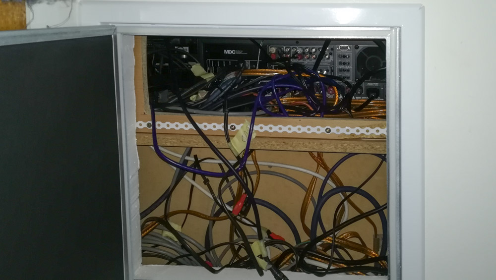 Zwei Geräte throhnen oben auf. Die sichtbaren Kabel sind in einem kurzen „Schlauch“ geführt und vefschwinden nach 20 cm nach unten in den versteckten Raum.