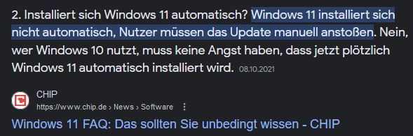 Ich dachte immer das man den Versionsupdates explizit mehrfach zustimmen muss beim runterladen?BlueDanube hat geschrieben: Sa 24. Jun 2023, 10:14 Windows 10 meldete, ein Sicherheits-Update machen zu müssen. Also Neustart, lange warten und ... jetzt habe ich Windows 11.![]()